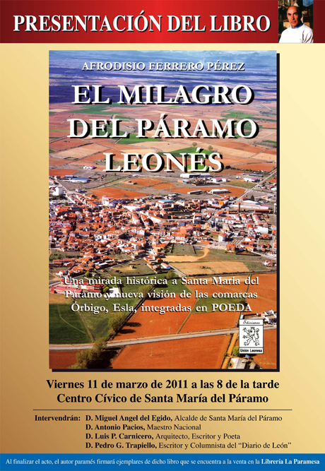 El próximo viernes 11 de marzo a las 8 de la tarde y en el Centro Cívico de Santa María del Páramo, tendrá lugar la presentación del libro «El Milagro del Páramo Leonés» escrito por Afrodisio Ferrero Pérez.
