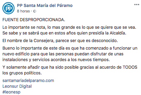 Cierto es que la fuente es más grande que la del resto del texto que aparece en la placa, no le falta razón al PP en ese aspecto. También es muy cierto que debería aparecer también el nombre de la Consejera de Familia e Igualdad de Oportunidades de la Junta de Castilla y León, Doña Alicia García Rodríguez, que para algo sus padres le pusieron un nombre. Aunque desde el Ayuntamiento han aclarado que ha sido la misma Consejería la que indicó que en la placa debía aparecer el cargo de la Consejera sin el nombre, como veis en la captura inferior.