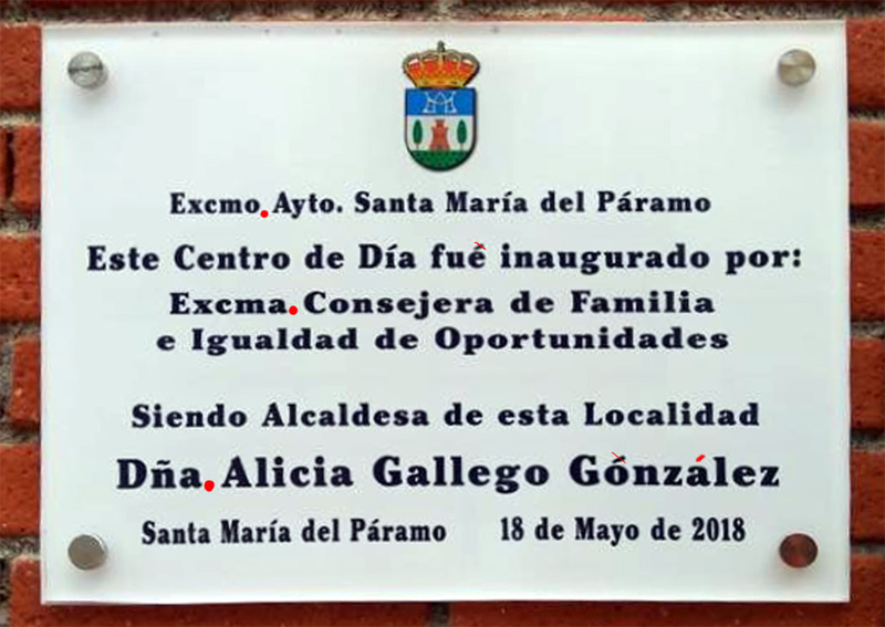 Pero también falta un punto después de Exmo, de Dña y de Exma, dado que en castellano la escritura de abreviaturas siempre se cierra con un punto, también sobra la tilde en la palabra fue, que se escribe sin tilde, como bien han apuntado en los comentarios, o el mismo apellido de la alcaldesa, que González, lleva la tilde en el A, no en la O, por lo que la placa debería de ser así: